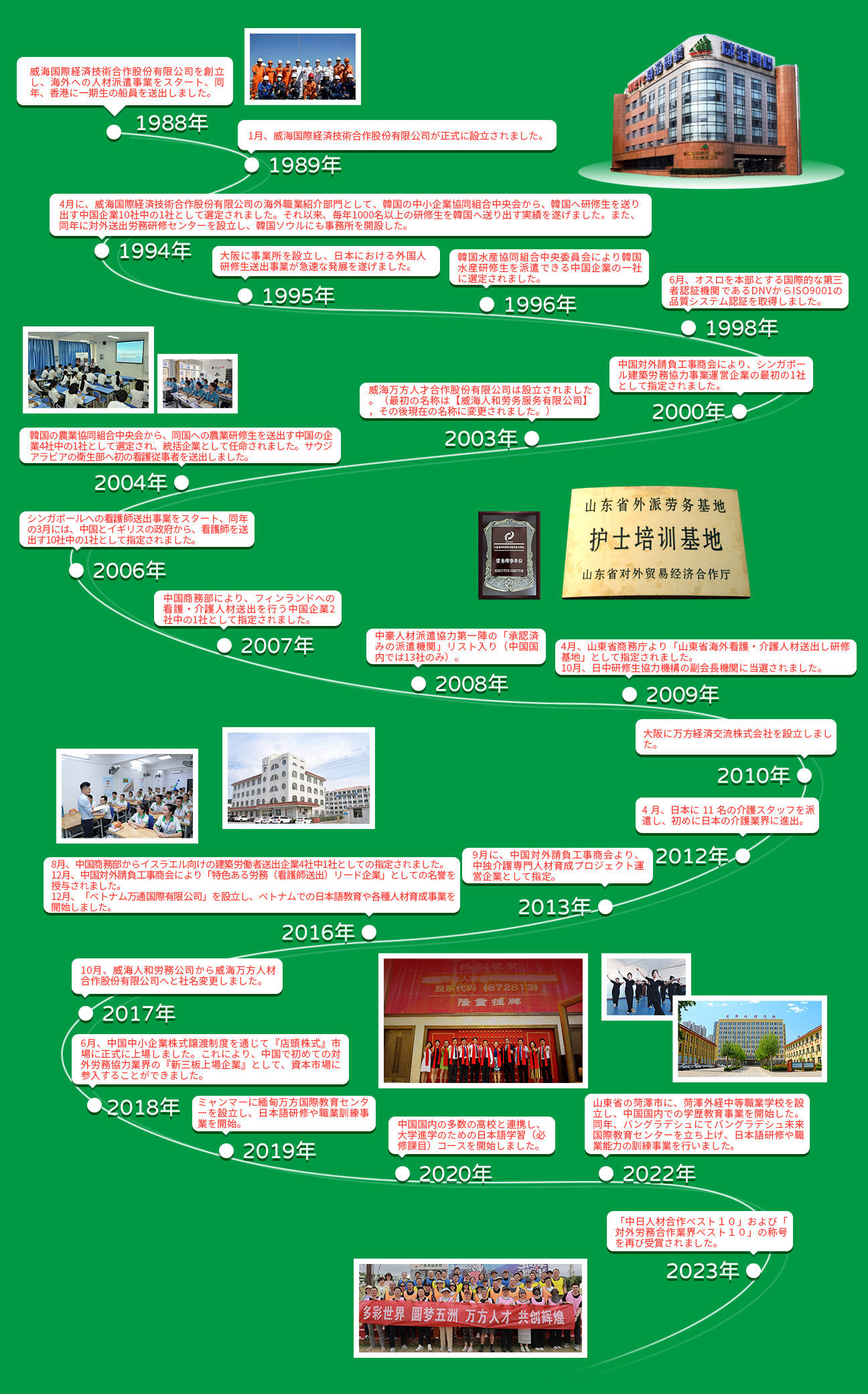 當社はここまでの36年間にわたり、海外人材派遣を主力事業として、既に日本、韓國、シンガポール、イスラエル、ドイツ、オーストラリア、ニュージーランド、イギリス、アフリカ等30カ國と地域に約12萬人の各種の技術人材を累計12萬人送り出ししており、食品、電子、自動車部品、建設、介護、ホテルサービス、船員、溶接、機械加工等50以上の職種をカバーしています。