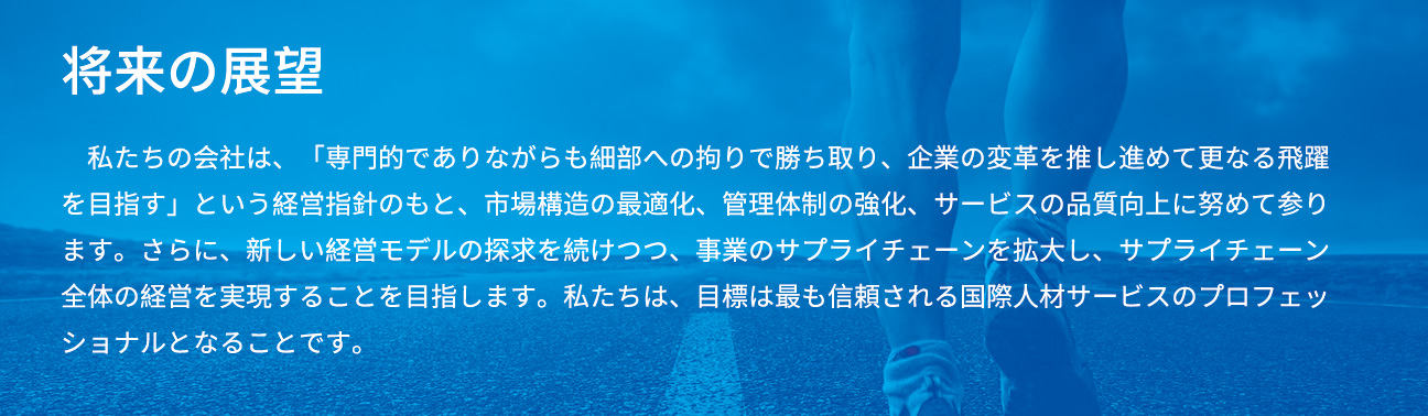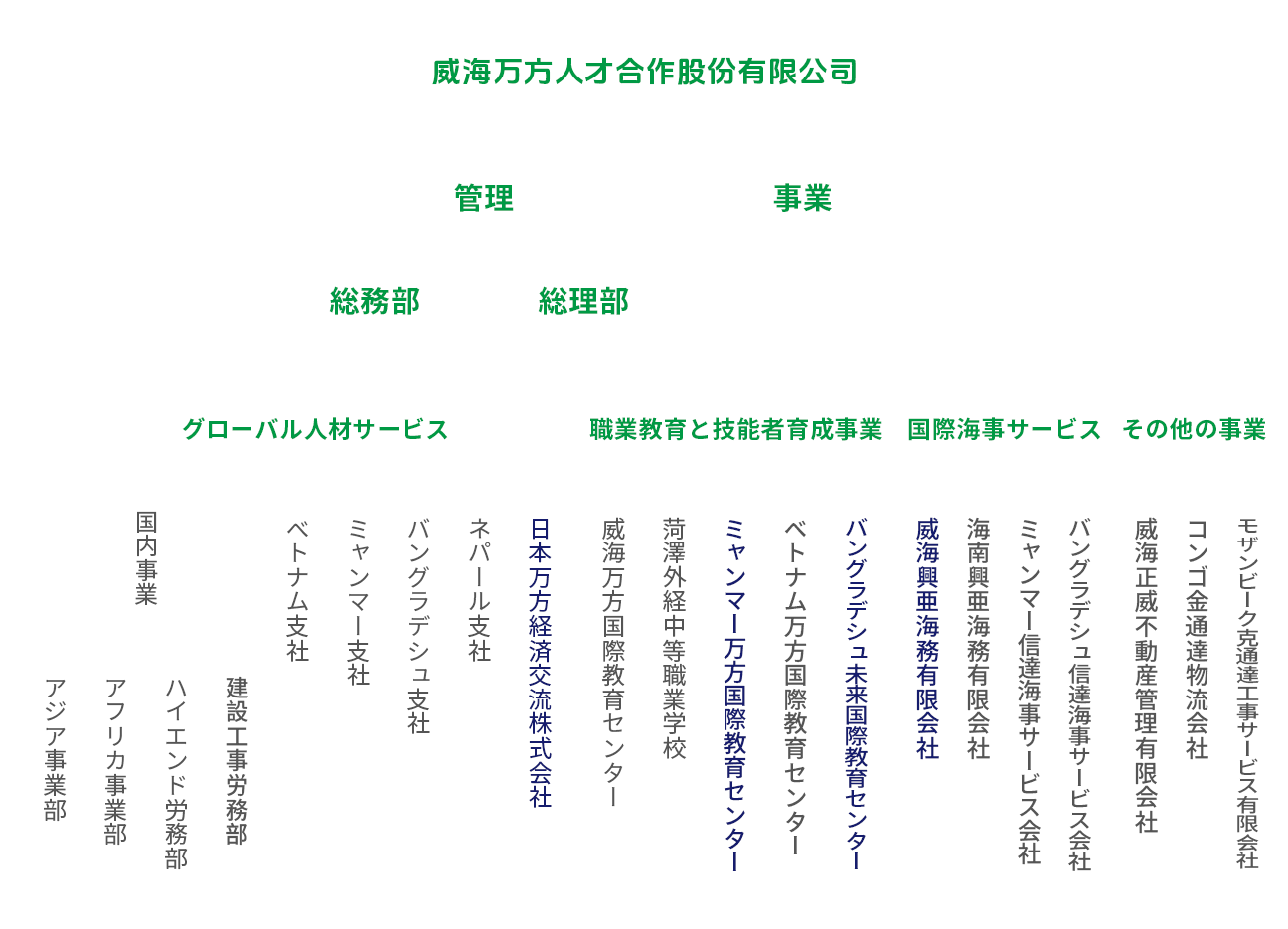 當社の事業內容は、國內外の人材派遣サービス(海外労働者送出事業を含む)、職業教育訓練、國際海事サービス、不動産管理サービス、國際貿易、資本運営等、多岐にわたる分野に及んでいます。當社は2017年に持株制度への仕組み変更を実施し、2018年6月に全國中小企業株式譲渡システムに上場し、正式に資本市場に進出しました(証券コード:872813)。